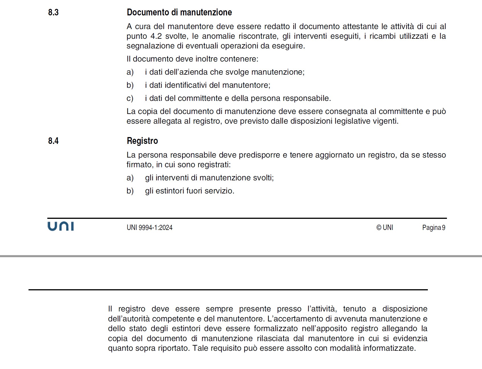 Per quanto riguarda gli estintori d’incendio, il riferimento tecnico specifico è la norma UNI 9994-1:2024, che disciplina in modo puntuale: